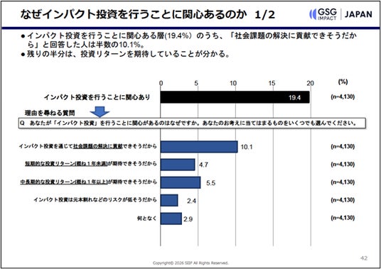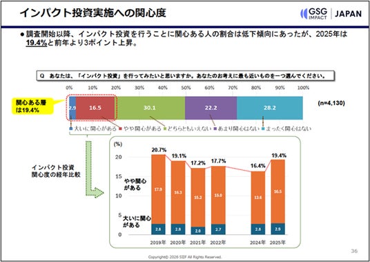インパクト投資を実際に行うことに「関心がある」と回答した層は19.4%となり、前年から3ポイント上昇しました。