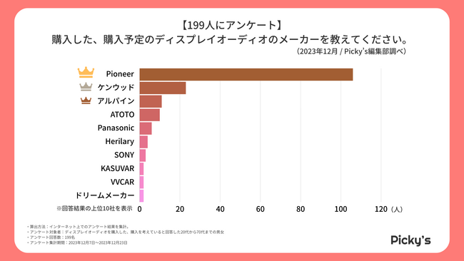 「Pioneer」が最も多い結果となりました。続いて「ケンウッド」、「アルパイン」が選ばれています。