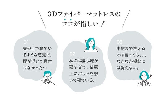 スカイブリージーマットレスは、これまでの3Dファイバーマットレス(当社従来品)のご使用者様から寄せられたご不満の声に正面から向き合い、設計を徹底的に見直しました。