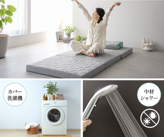 カバーは洗濯機で、中材はシャワーで洗える「フルウォッシャブル仕様」。洗うことができないマットレスとは違い、常に清潔な寝具環境を保てます。アレルギー対策や小さなお子さまのいるご家庭にも安心です。中材は3つのパーツに分かれるので、気軽に丸洗いできます。