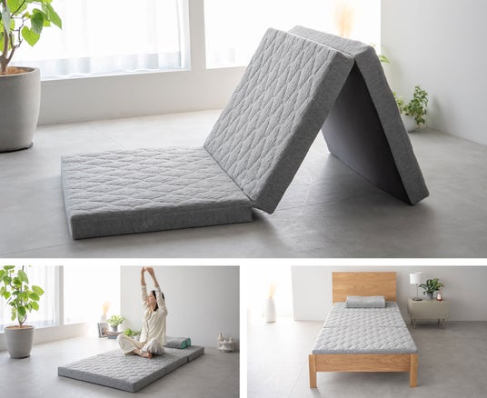 使わない時は三つ折りでコンパクトに収納可能。床でもベッドでも使用でき、寝室から来客用まで幅広く活躍します。シングル・ダブル・クイーンサイズと3サイズ展開です。