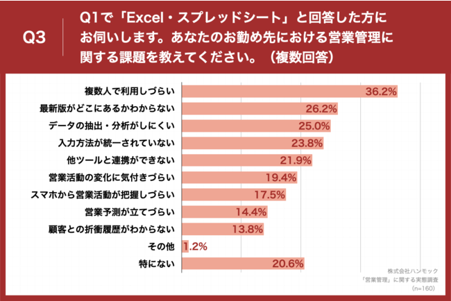 「Q3.Q1で「Excel・スプレッドシート」と回答した方にお伺いします。あなたのお勤め先における営業管理に関する課題を教えてください。(複数回答)」(n=160)と質問したところ、「複数人で利用しづらい」が36.2%、「最新版がどこにあるかわからない」が26.2%、「データの抽出・分析がしにくい」が25.0%という回答となりました。
