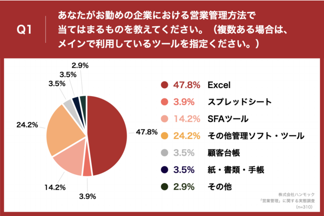 「Q1.あなたがお勤めの企業における営業管理方法で当てはまるものを教えてください。(複数ある場合は、メインで利用しているツールを指定ください。)」(n=310)と質問したところ、「Excel」が47.8%、「スプレッドシート」が3.9%という回答となりました。