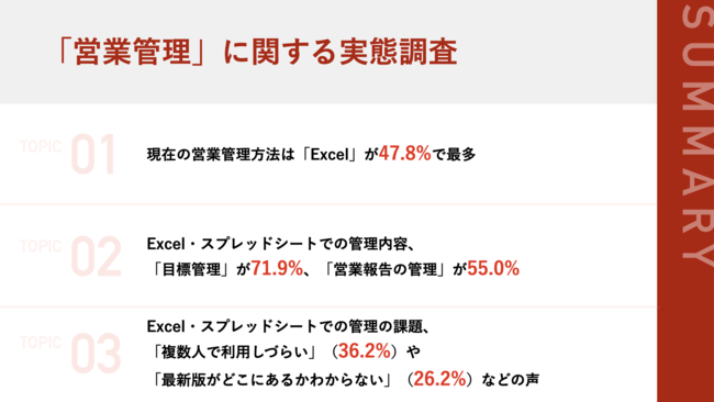 今回は、従業員数100名以上の企業の営業管理職310名を対象に「営業管理」に関する実態調査を行い、管理方法に、47.8%が「Excel」3.9%が「スプレッドシート」を活用していることが判明しました。