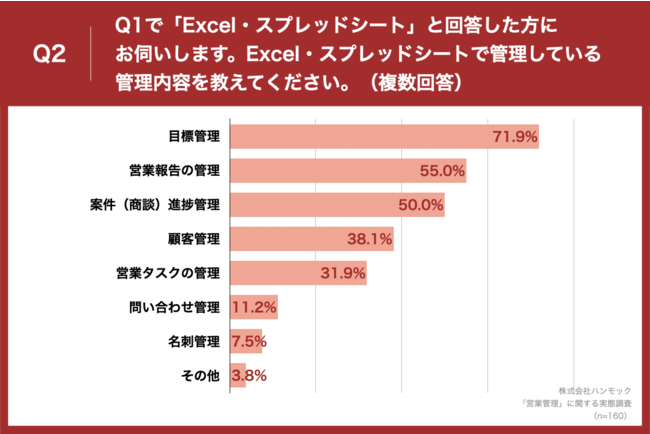「Q2.Q1で「Excel・スプレッドシート」と回答した方にお伺いします。Excel・スプレッドシートで管理している管理内容を教えてください。(複数回答)」(n=160)と質問したところ、「目標管理」が71.9%、「営業報告の管理」が55.0%、「案件(商談)進捗管理」が50.0%という回答となりました。