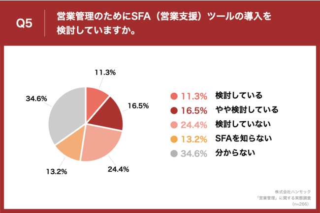 「Q5. Q1で「SFAツール」と回答した以外の方にお伺いします。営業管理のためにSFA(営業支援)ツールの導入を検討していますか。」(n=266)と質問したところ、「検討している」が11.3%、「やや検討している」が16.5%という回答となりました。