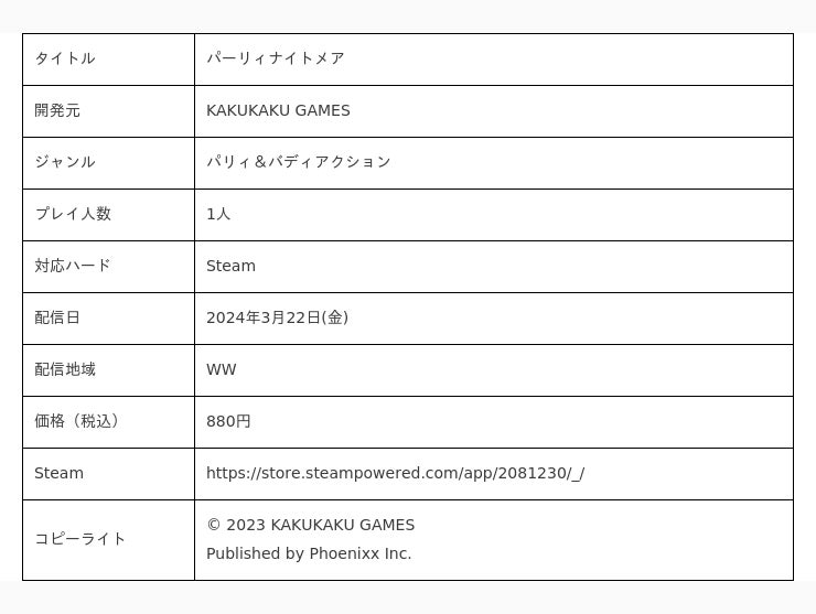 株式会社Phoenixx(フィーニックス)(東京都武蔵野市、代表取締役社長:坂本 和則)より2024年3月1日(金)に配信開始を予定しておりました『パーリィナイトメア』のSteam版につきまして、さらなるクオリティアップのため、配信日を延期させていただくこととなりました。変更後の配信日につきましては、2024年3月22日(金)を予定しております。