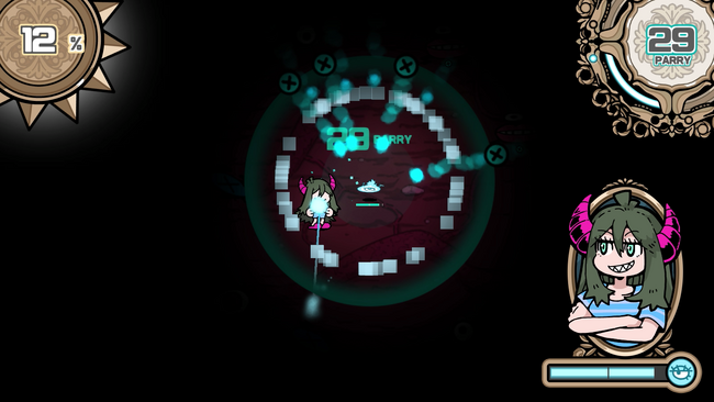 タマシイは“パリィ”でトラウマの具現化である敵をはじくことができ、ホンノウちゃんははじいた敵を撃破できる。