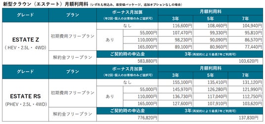 *2 <新型クラウン(エステート)プラグインハイブリッド車>最安値パッケージ、追加オプション無し、「初期費用フリープラン」の7年契約・年2回のボーナス月加算165,000円(税込み)の場合。7年間の総支払額は、11,014,080円(税込み)