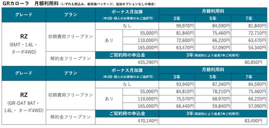 *4 <GRカローラ RZ(6MT)>最安値パッケージ、追加オプション無し、「初期費用フリープラン」の7年契約・年2回のボーナス月加算165,000円(税込み)の場合。7年間の総支払額は、6,874,560円(税込み)