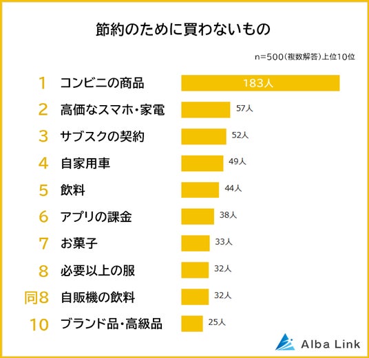 株式会社AlbaLink(本社:東京都江東区、代表取締役:河田 憲二)は、全国の男女500人を対象に「節約のために買わないもの&しないことに関する意識調査」を実施し、そのデータをランキングにしました。