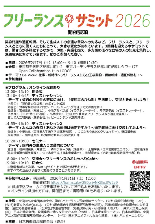 紀尾井町戦略研究所株式会社(本社:東京都港区、代表取締役社長:別所 直哉、以下KSI)は、日本労働組合総連合会(連合)が実施する「フリーランスサミット2026」に運営事務局として参加しています。参加費は無料で、事前の登録が必要です。