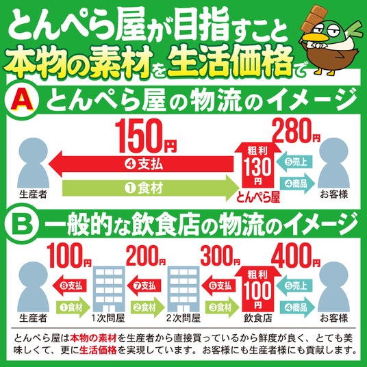 - 『とんぺら屋』は、全国150店舗展開する居酒屋『新時代』の姉妹ブランドです。名物商品は、新時代の名物『伝串』と同じ味付けの『とんぺら焼き』です。注文率は100%を超え、1本90円で販売しております。1本90円で楽しめる『とんぺら焼き』は見た目も味も好評で、芸術品とまで言われております。
