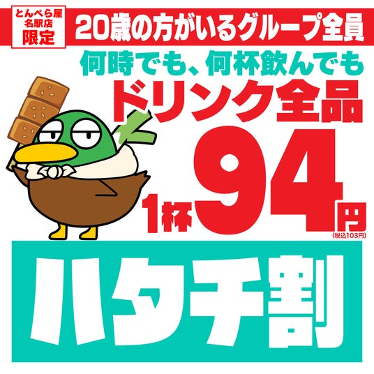 【若者応援】何曜日でも、何時でも、何杯飲んでも、ドリンク全品1杯94円。全国200店舗の飲食店を運営する、株式会社ファッズ(愛知県名古屋市、代表取締役社長:佐野 直史)が『とんぺら屋 名駅店』で開催。