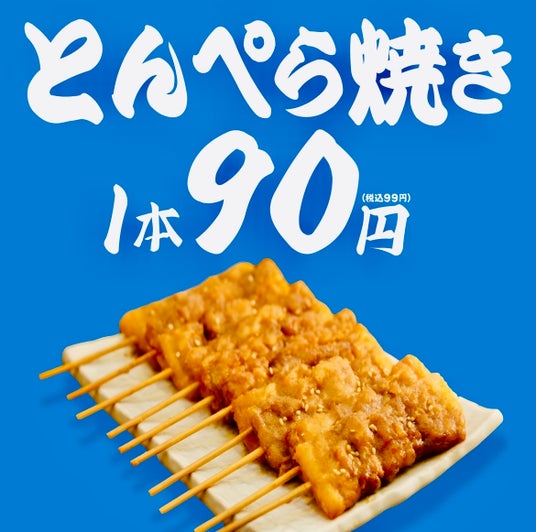 『とんぺら屋』にご来店頂いた方が必ずといっていいほど、ご注文頂くのが『とんぺら焼き』です。とんぺら焼きは、1本90円の豚ばら串です。一度食べると、やみつき。思わず何本も食べたくなり、注文率は100%超え!名物商品です。