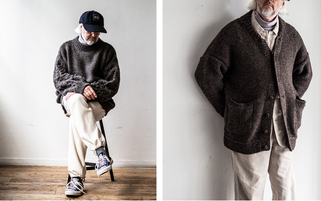 天然素材を強みとして、ワークやミリタリーといった普遍的なアイテムに、素材からひき出した味わい深さを独自の感覚で落とし込む〈コンフェクト(CONFECT)〉。21AWシーズンに引き続き、ペルーよりハンドニットを新型でご用意します。