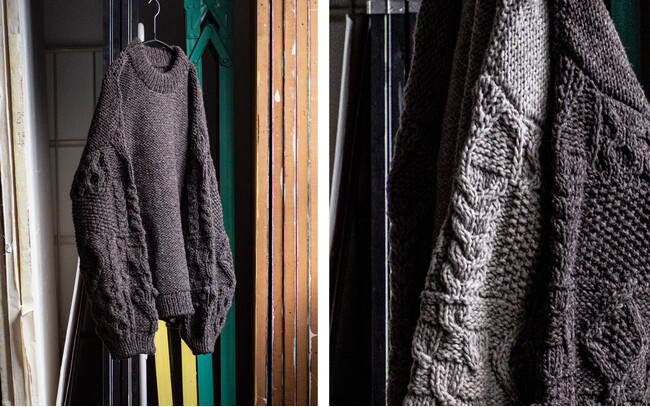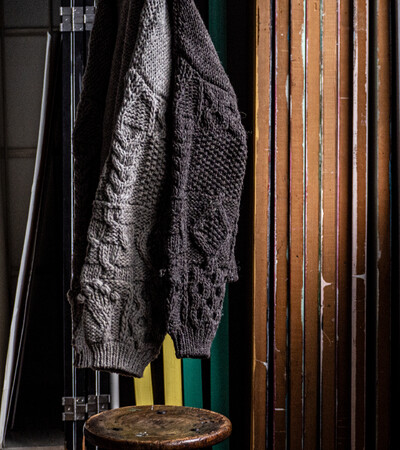英国トラッドのアランセーター編み柄にあるケーブル・ハニカム・ダイヤモンド・木模様などを元にパッチワーク調に編立てています。デザイン性と共に着易さを考慮し、編み柄は両袖のみに入れアクセントに。