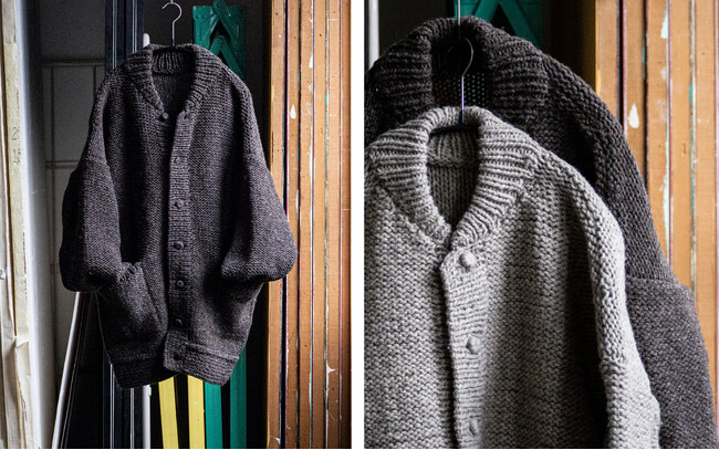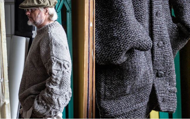 トラディショナルなショールカラーデザインから衿や返りの位置をアレンジし、スタジャンの様な雰囲気を持ったカーディガン。袖口・裾はガーター編みで厚みの表情を変えています。釦は同じ毛糸で作った温かみのあるニットボタンで全体的に均整の取れた仕様に。