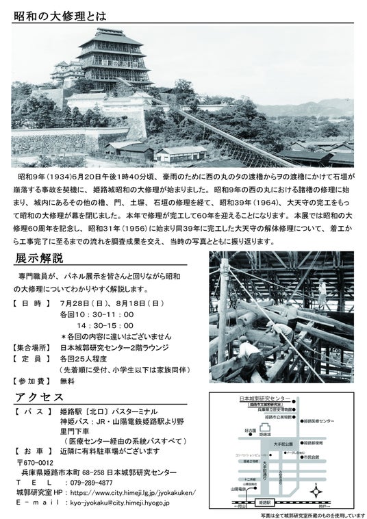昭和9年(1934)6月20日午後1時40分頃、豪雨のために西の丸のタの渡櫓からヲの渡櫓にかけて石垣が崩落する事故を契機に、姫路城昭和の大修理が始まりました。昭和9年の西の丸における諸櫓の修理に始まり、城内にあるその他の櫓、門、土塀、石垣の修理を経て、昭和39年(1964)の大天守の完工をもって昭和の大修理が幕を閉じました。本年で修理が完工して60年を迎えることになります。本展では昭和の大修理完工60周年を記念し、昭和31年(1956)に始まり同39年に完工した大天守の解体修理について、着工から工事完了に至るまでの流れを調査成果を交え、当時の写真とともに振り返ります。