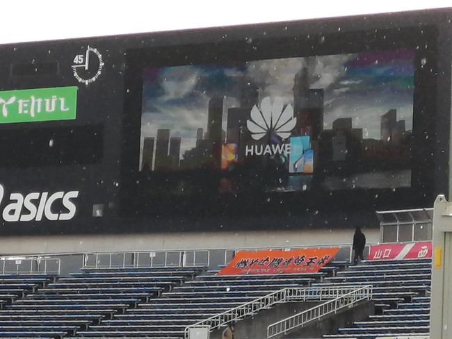 このほか、発着点になったたけびしスタジアム京都(西京極陸上競技場)のトラック周辺に広告看板を設置したほか、アーチにも社名が掲示されました。女子、男子のスタート前には、スタジアムの大型スクリーンにファーウェイ・ジャパンのCMが流れました。