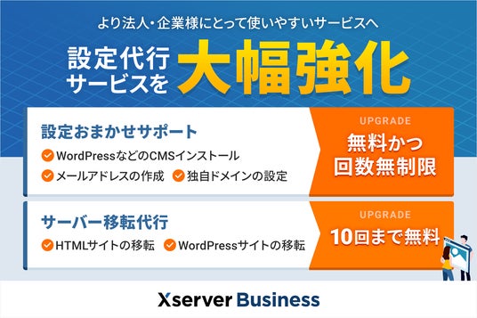 エックスサーバー株式会社(所在地:大阪市北区、代表取締役:小林 尚希)は、2024年9月17日、法人向けレンタルサーバー『Xserverビジネス』において、お客様の様々な設定作業を代行する「設定代行サービス」の名称を「設定おまかせサポート」に変更し、サービス内容も大幅に強化しました。新しくなった「設定おまかせサポート」では、すべてのプランにおいて、代行作業を【無料かつ回数無制限】で依頼することができます(※1)。また、これまで1つのサーバー契約につき1回まで無料だった「サーバー移転代行」も、今回の強化で【10回まで無料】で依頼可能になり、より法人・企業様にとって使いやすいサービスとなりました。