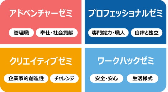 前半の4カ月は、キャリア診断の結果を参考に所属したいゼミを4つの中から新入社員が選択します。管理職志向の高い「アドベンチャーゼミ」ではビジネスモデルやリーダーシップ、創造性を重視する「クリエイティブゼミ」ではデザイン思考やアイデア発想力など、ゼミごとのテーマに沿って設定された動画教材で各自が学習を進めます。個人の志向に合った内容により主体的な学びを促すとともに、参加者がゼミ内でおすすめの教材を紹介したり、仕事上の悩み・取り組みを共有したりすることで、同期同士のつながりにより、学習・業務への関心を広げます。