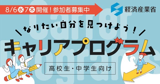 私たちをとりまく社会は日々変化し、さまざまな価値観や働き方が広がっていく時代です。この夏、経済産業省では、未来に向かって大きく羽ばたいていく高校生・中学生のみなさんを対象に、特別な2日間をお届けします。多彩なキャリアを歩む先輩たちの話を聞いて、「なりたい自分」を見つけよう!