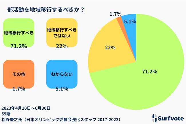 SNSとテクノロジーで社会課題の発見・解決をサポートするICTスタートアップのPolimill株式会社(ポリミル、本社:東京都港区、代表取締役:横田えり、以下Polimill社)は、Surfvoteオーサー松野慶之氏が提起したイシュー(課題)「部活動を地域移行するべきか?」の投票結果をお知らせします。