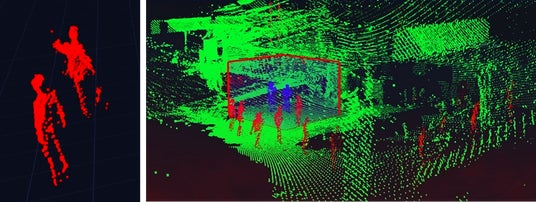左図:LiDARで観測した人の点群データ 右図:LiDARで観測した空間の点群データ