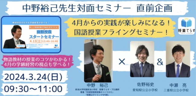 この度、私たちは2024年3月24日に、中野裕己先生対面セミナー直前企画「4月からの実践が楽しみになる!国語授業フライングセミナー」講座の開催を発表いたします。このイベントは、4月からの国語授業のポイントが見えます。授業てらすメンバー2人の物語教材の実践紹介のほか、てらすメンバー2人と中野裕己先生との「授業づくりにおいて大切にしていること」についての座談会もあります。4月から実践が楽しくなる内容を詳しく学ぶことができる貴重な機会です。