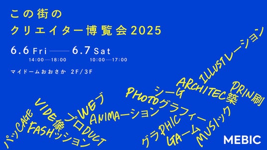 大阪のクリエイター支援拠点であるクリエイティブネットワークセンター大阪 メビック(※1)は、大阪・関西万博開催期間中の2025年6月6日(金)・7日(土)、過去最大規模となる「この街のクリエイター博覧会2025」をマイドームおおさかで開催します。本展には、デザイン、ウェブ、映像、ゲーム、建築など多彩なジャンルの大阪のクリエイターに加え、海外のクリエイティブ関連機関も初参加。国内外から総勢182組が出展します。万博で世界から注目が集まる好機に、大阪が誇るクリエイティブパワーを国内外に向けて発信し、新たな出会いやコラボレーション、国際的な交流の機会を創出します。