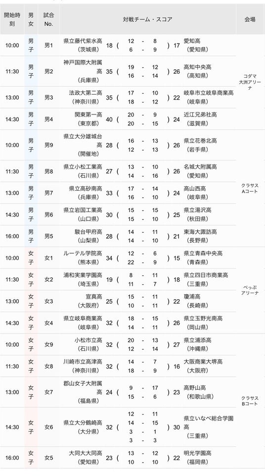 男女各9試合が行われ、地元・大分県の男子・大分雄城台高等学校、女子・大分鶴崎高等学校などが2回戦へとコマを進めました。