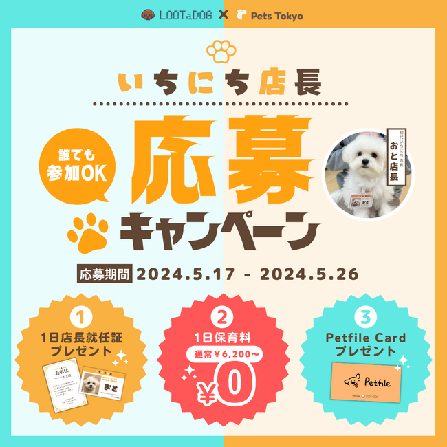 ペットの健康応援アプリ「LOOTaDOG」に加え、スマホをかざすだけで自慢のペットを紹介できるデジタル名刺「Petfile Card」の開発・販売を行う株式会社LOOTaDOG JAPAN(以下LOOTaDOG JAPAN)は、Pets Tokyo株式会社(以下Pets Tokyo)とコラボレージョンを実施し、ペットサロンの1日店長募集キャンペーンを行います。