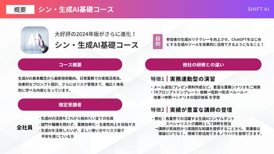 「日本をAI先進国に」を掲げAIのビジネス活用を学べる利用者数No.1※のAI大学「SHIFT AI」を運営する株式会社SHIFT AI(東京都渋谷区、代表取締役 木内翔大、以下 当社 )は、法人向け新サービス「シン・生成AI基礎コース」を2025年5月9日より提供開始します。本コースは、迷ったらまず受けるべき全社員向けの生成AI研修として、生成AIの基本概念から最新技術動向、日常業務での実践活用法、効果的なプロンプト設計、さらにはリスク管理まで、幅広く体系的に学べる内容となっています。
