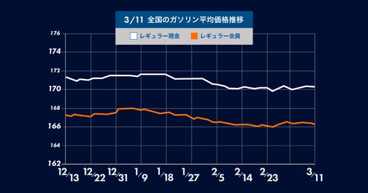 3月11日(月) 時点のレギュラーガソリンの全国平均は、170.3円となり先週から0.3円の値上がり。8週間ぶりの値上がりとなりました。
