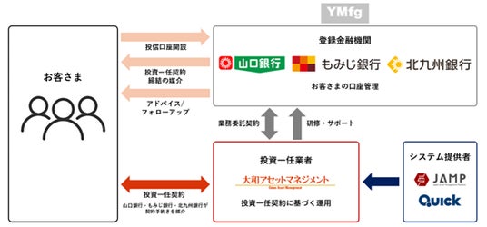 本サービスは、主に個人のお客さまを対象とした投資一任運用サービスです。当社がお客さまとの間で投資一任契約を締結し、山口銀行、もみじ銀行、北九州銀行の各行がアドバイザーとして、お客さまにゴールベースアプローチに基づくライフプランのアドバイスおよびゴール実現に向けた継続的なフォローアップを行います。また、お客さまの契約資産は、各行の投資信託口座において管理されます。なお、サービス運営に係る事務およびシステムについては、同分野において豊富な経験と実績を有する日本資産運用基盤株式会社および株式会社QUICKと連携します。