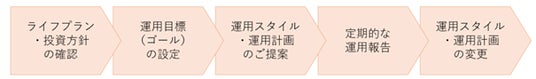 お客さまのライフプランをもとに運用目標(ゴール)を設定し、リスク許容度を踏まえた運用計画の策定からサービス提供、継続的なフォロー(進捗管理)までを一気通貫で行う提案手法です。「何のために資産を運用するのか」という目的を明確にし、その実現に向けて伴走支援します。