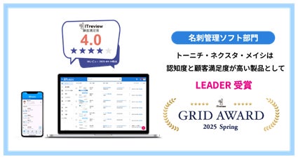東日印刷株式会社(本社:東京都江東区、社長:西川光昭、以下 TONICHI〈https://tonichi-printing.co.jp〉)のIT事業部門・T-NEXT本部が開発・販売する法人向け名刺管理アプリ「ネクスタ・メイシ」(https://tnexta.com/) が、IT製品/SaaSのレビューサイト「ITreview」の「ITreview Grid Award 2025 Spring」で、認知度と顧客満足度の高いサービスに贈られる「LEADER」を受賞しました。