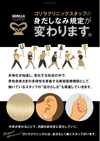 全国22院展開する男性専門の総合美容医療「ゴリラクリニック」(医療法人社団十二会、東京都新宿区、総院長 稲見文彦、以下「当院」)では、男性患者さまの多様性を認める当院コンセプトにあわせ、働く従業員に対しても個性を尊重し生き生きと働きやすい環境づくりを進めたいという思いから 2024年1月に「身だしなみ規定」を改定(緩和)。その実施から丸9か月が経過しました。