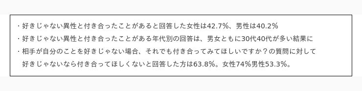 男女ともに40%以上が、好きじゃない異性と付き合ったことがあると回答しました。