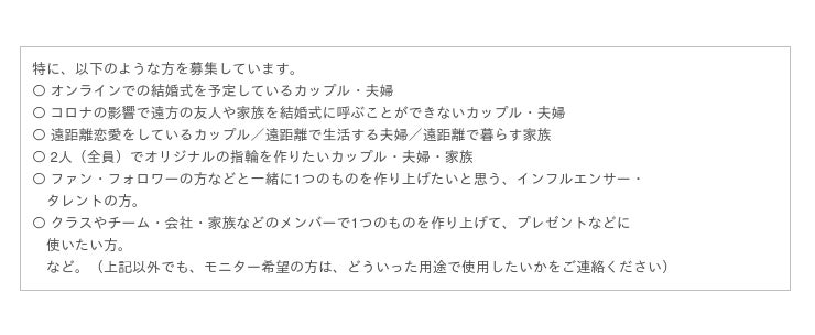 このたび、大切な人と特別な体験をシェアできるコロナ禍ならではのサービスとして、『私たちのカタチ-指輪-』の無料体験モニターを、7月27日(火)より8月31日(火)まで、10組限定で募集します。