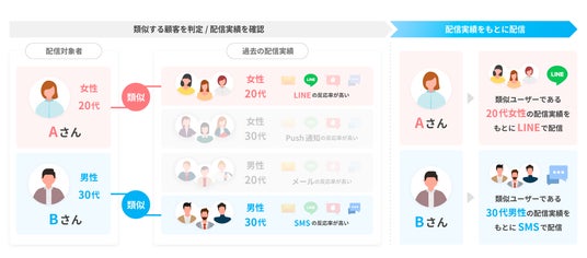 - AIが類似ユーザーの過去の配信実績を分析し、各ユーザーにあったチャネルを予測