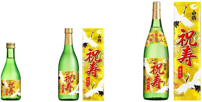 商品特長 米と米こうじ、水だけで仕込んだまろやかですっきりとした後味が特長の純米酒に、華やかな金箔を加えました。「祝寿」の名にちなみ、鶴などの長寿の象徴やおめでたいモチーフで華やかに飾りたて、金箔の屏風絵のような優雅な世界観を演出し、高級感を高めた煌びやかな意匠に仕上げました。