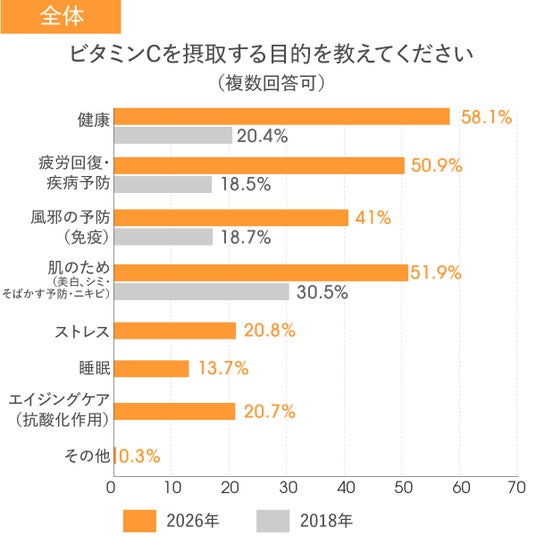 ビタミンCを摂取する目的について、2018年調査では「美白」「シミ・そばかす対策」など、肌を中心とした美容目的が最上位でした。一方、2026年調査では、「健康維持(58.1%)」「疲労回復・疾病予防(50.9%)」「風邪予防(免疫)(41.0%)」がいずれも高い割合を示し、肌目的(51.9%)と並んで上位に位置しています。