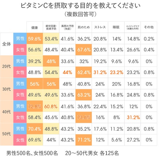 この結果から、女性は美容を起点に複数の効果を期待し、男性は健康・実用面を重視する傾向がある一方で、免疫目的については男女ともに高く、ビタミンCが性別を問わず日常の健康対策として位置づけられていることが分かります。