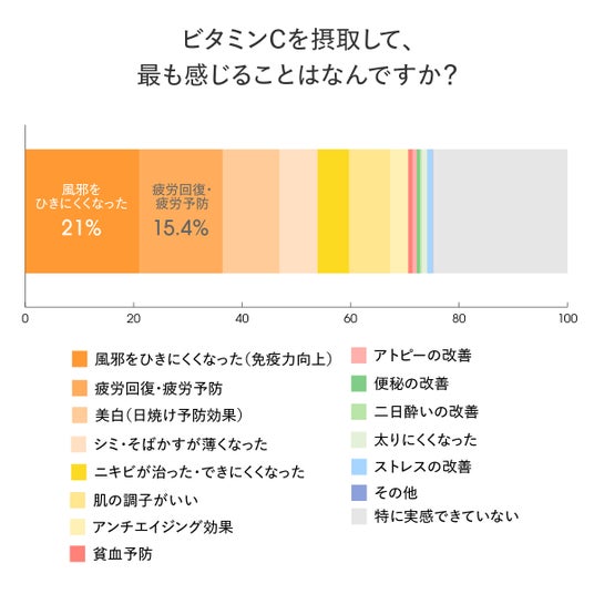 これらの結果から、ビタミンCは免疫や疲労といった体調面を中心に、生活のさまざまな場面で実感されている栄養素であることがうかがえます。