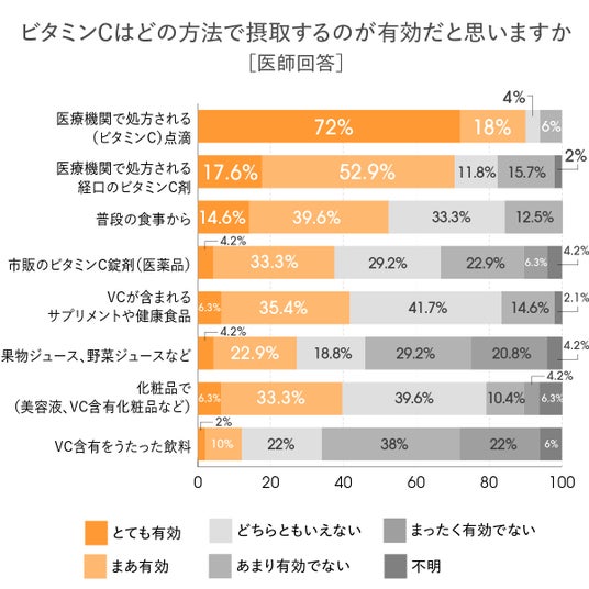 これらの結果から、医師はビタミンCの有効性を判断する際、摂取の有無そのものよりも、摂取形態や体内でどれだけ安定して利用されるかといった点を重視していることがうかがえます。