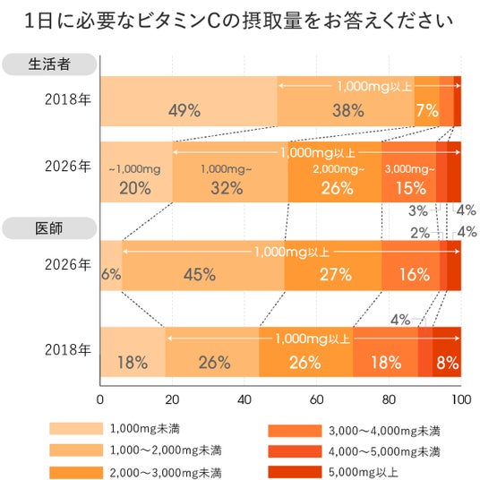 一方、医師調査では、2026年において「1,000mg以上」を推奨する割合が9割以上を占めました。これは、2018年調査(約8割)と比較して、低用量を想定する医師がさらに減少したことを示しています。