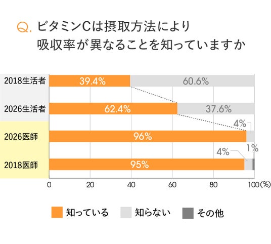 「ビタミンCは摂取方法により吸収率が異なることを知っている」と回答した生活者は、2026年では62.4%となり、2018年調査(39.4%)と比較して大きく増加しました。この結果から、生活者の理解はこの8年間で着実に進んでいることが分かります。