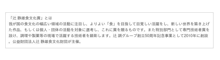 ◎辻静雄食文化賞事務局:小阪、正戸(辻静雄料理教育研究所内) TEL:06-6629-6200